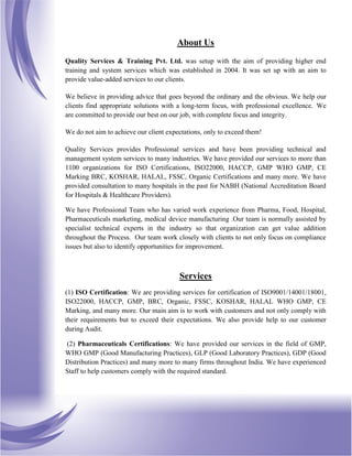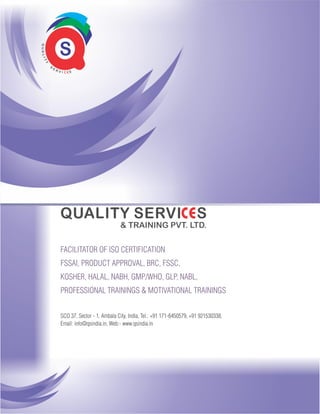 Quality Services & Training Pvt. Ltd. was established in 2004 to provide high-end training and system services, aiming to exceed client expectations in various industries, including pharmaceuticals and food safety. The company offers services such as ISO certifications, pharmaceuticals certifications, CE marking, and professional training, supported by a skilled team and a client-focused approach. With a well-equipped office in Ambala, the organization emphasizes long-term client relationships and success through comprehensive improvement strategies.