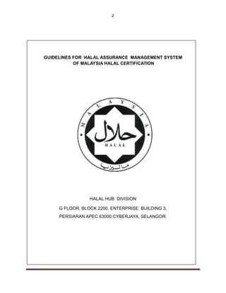 The document outlines guidelines for a Halal Assurance Management System aimed at ensuring the integrity and compliance of halal products in Malaysia. It provides a framework for halal certificate holders to establish effective internal processes, including an Internal Halal Committee, training programs, and traceability measures. The guidelines emphasize the importance of documentation, control measures, and corrective actions to maintain halal standards throughout the supply chain.