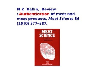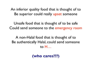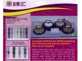 The document discusses halal food production and authentication, emphasizing the importance of controlled processes, compliance with halal standards, and the need for proper documentation to ensure halal integrity. It highlights consumer awareness, market dynamics, and certification requirements in the halal food industry, which is worth an estimated USD 150 to 500 billion annually. Additionally, it covers issues surrounding the authenticity of halal products and the technological advancements in verifying halal compliance, including DNA testing methods.
