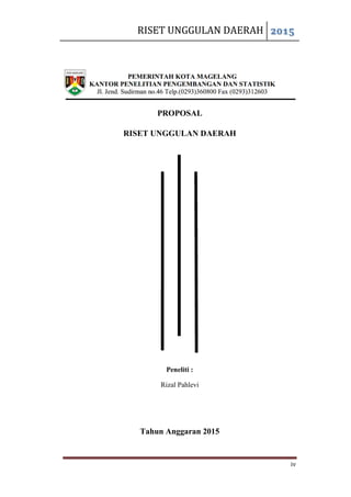 Proposal penelitian oleh Rizal Pahlevi bertujuan untuk mengevaluasi efektivitas program pelatihan kerja dalam mengurangi pengangguran di Kota Magelang. Penelitian ini direncanakan berlangsung selama 3 bulan dengan biaya sebesar Rp 15.000.000. Penelitian ini penting untuk meningkatkan pelaksanaan program pelatihan kerja agar lebih efektif dalam mengatasi masalah pengangguran.