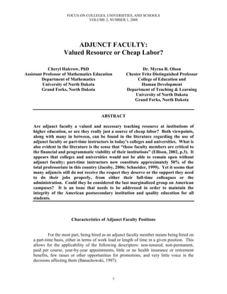 The document explores the role of adjunct faculty in higher education, presenting conflicting views on whether they are a valued resource or merely a source of cheap labor. It highlights the economic reasons for their employment, the lack of benefits and support, and the impact of their marginal status on teaching quality and student success. The authors argue for the necessity of addressing these disparities to maintain the integrity and quality of education in American colleges and universities.