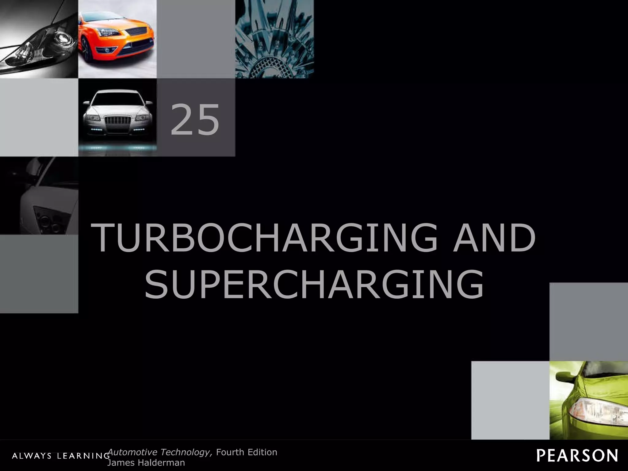 The document provides information about turbocharging and supercharging engines. It explains that turbochargers and superchargers work by forcing more air into the engine cylinders to increase power. A turbocharger uses exhaust gases to power a turbine, which drives an air compressor, while a supercharger is driven directly by the engine. The document describes the different types of superchargers and turbochargers, and discusses how boost pressure is controlled and maintenance procedures for forced induction systems.