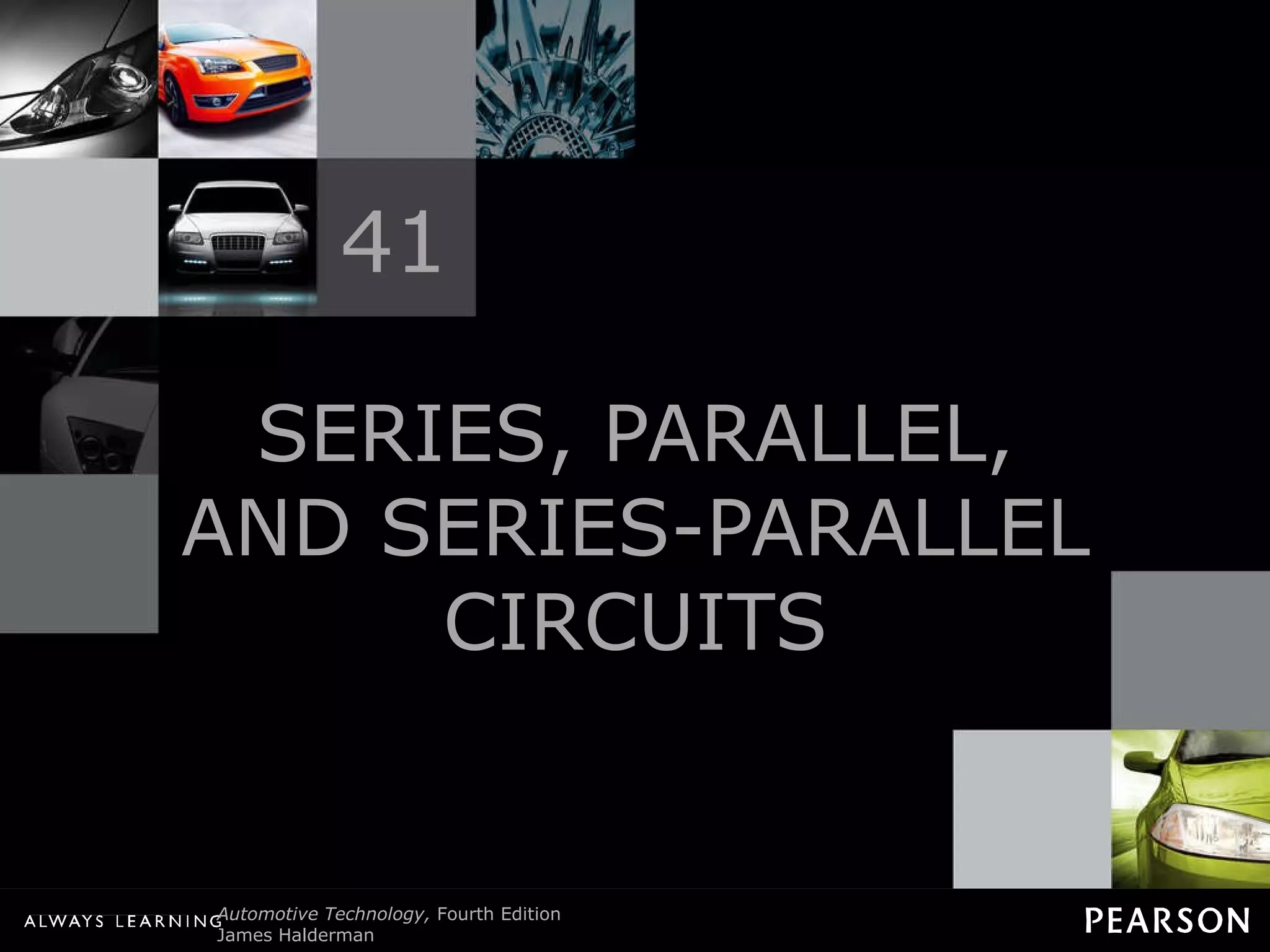 This document discusses series, parallel, and series-parallel circuits. It begins by defining the objectives and characteristics of each type of circuit. Key points include: