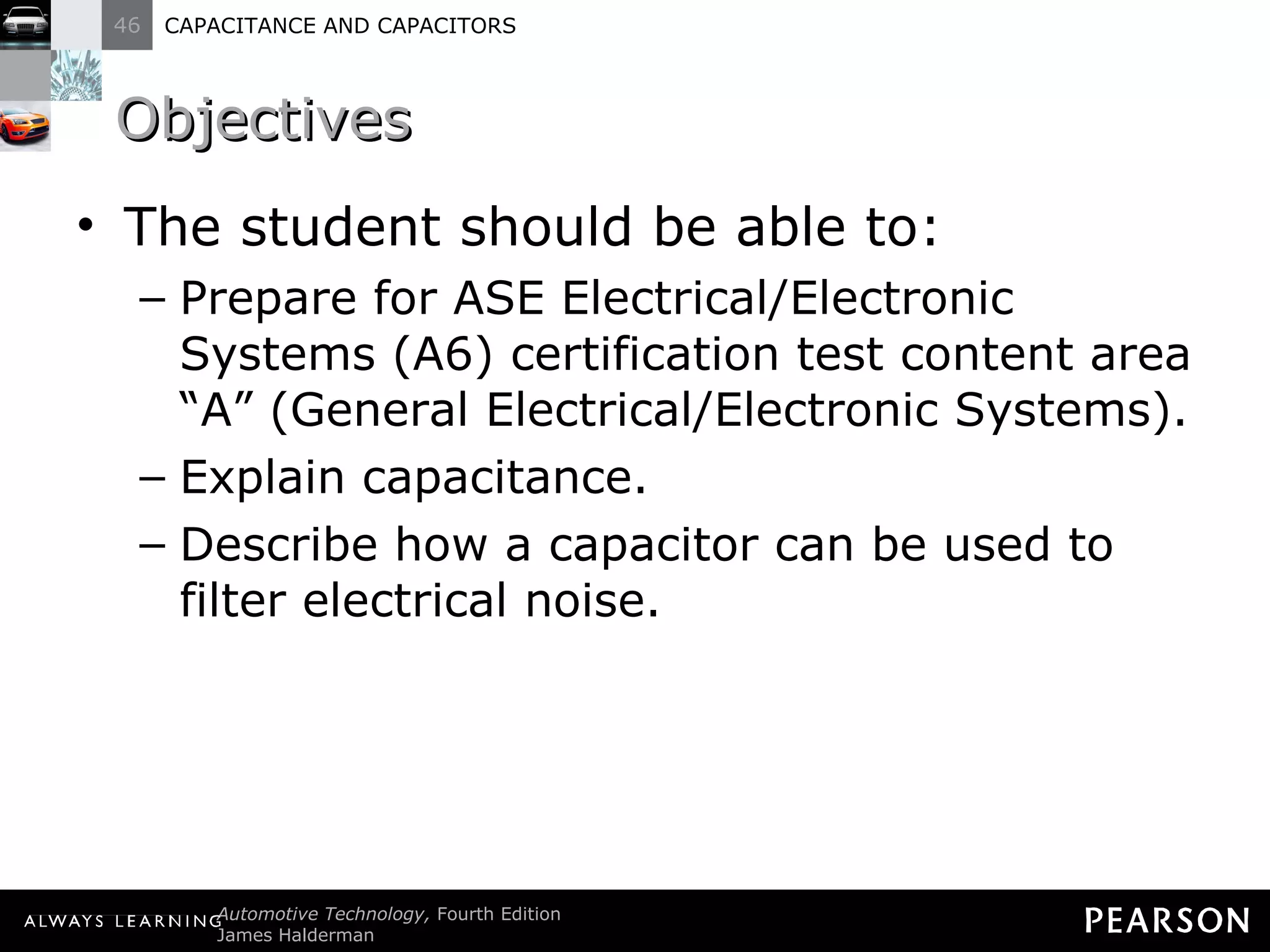 The document discusses capacitors and capacitance. It explains that a capacitor consists of two conductive plates separated by an insulating material. A capacitor can store an electrical charge between its plates. Capacitance depends on the plate area, distance between plates, and insulating properties of the material between the plates. Capacitors have various uses including filtering electrical noise, storing temporary power, and functioning as timers in electronic circuits.