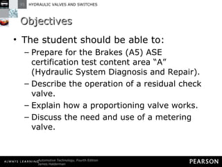 The document discusses various hydraulic valves and switches used in brake systems, including their purposes and operations. It describes residual check valves, pressure-differential switches, brake fluid level switches, proportioning valves, electronic brake proportioning, and metering valves. Proportioning valves control brake pressure to balance braking between the front and rear. Metering valves delay front brake application until sufficient rear brake pressure is achieved.