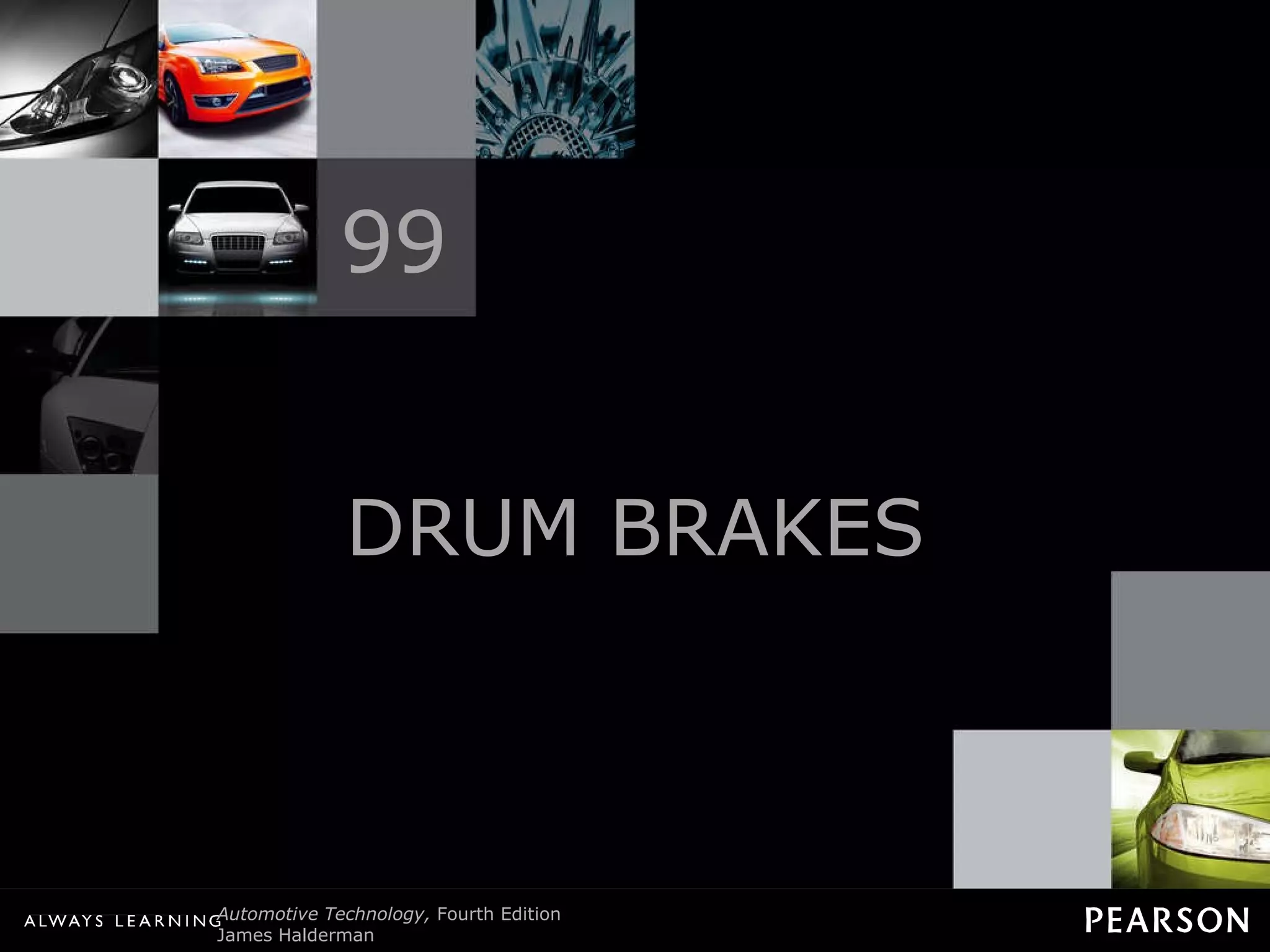 The document discusses drum brakes, including their components, operation, advantages, and disadvantages. It describes drum brake parts such as the backing plate, shoe anchors, wheel cylinders, brake shoes, and linings. It explains the differences between primary and secondary brake shoes and how drum brakes use self-energizing and servo action to provide stopping power. The document also discusses drum brake fade issues and methods for adjusting drum brakes.