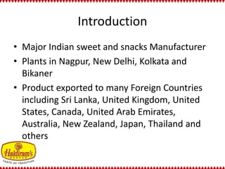 Haldiram's is a major Indian snack manufacturer established in 1937 in Bikaner, India. It has plants in several major Indian cities as well as exports products to over 10 countries. Namkeen snacks contribute 60% of Haldiram's total revenue. The company has over 100 product offerings and uses high quality, traditional Indian ingredients sourced from across the country. Haldiram's has received several awards and recognition for its products and operations.