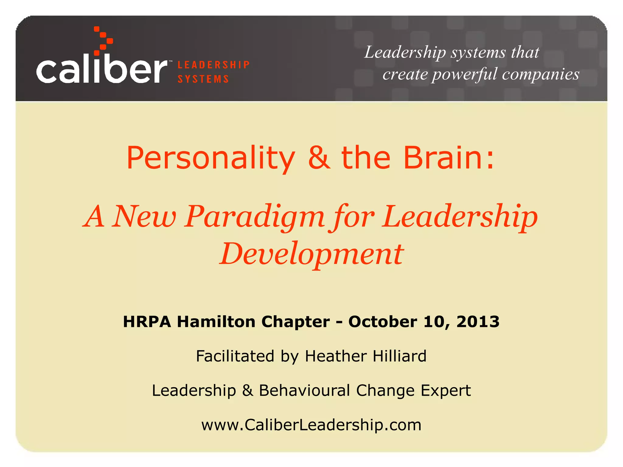 This document discusses a new paradigm for leadership development based on understanding the four functional areas of the brain and how they relate to different leadership styles. It presents a model of four types of leadership based on the brain's functional quadrants: business leadership focused on results from the left rational brain; strategic leadership providing vision from the right rational brain; social leadership focused on relationships from the right emotional brain; and process leadership ensuring procedures from the left emotional brain. It argues that most leaders only use one or two functions, limiting their effectiveness, and that leadership programs should target brain development rather than just behaviors to facilitate whole-brain leadership. Tools are proposed for developing individual leaders' brain functions and embedding whole-brain approaches into organizational systems and culture.