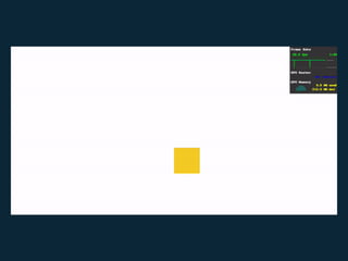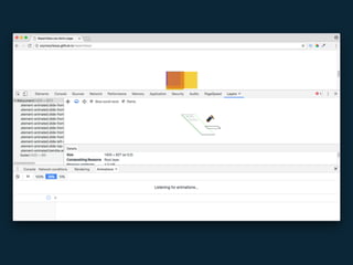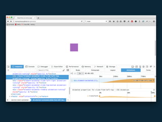 This document discusses optimizing CSS animations for performance. It recommends animating only transform and opacity properties when possible, using techniques like will-change, requestAnimationFrame, and FLIP to improve efficiency. Too many layers or overusing animations can hurt performance, so the document advises testing animations before optimizing further and only animating elements in top layers. Resources are provided for learning more about high-performance animation techniques.