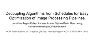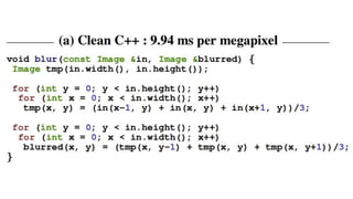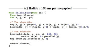 The document describes Halide, a domain specific language for image processing pipelines that decouples algorithms from schedules. This decoupling allows for easy optimization by specifying schedules that control parallelism, locality, and vectorization without changing the underlying algorithm. The Halide compiler then generates efficient code from the algorithm and schedule. Key features include expressing algorithms with Funcs and scheduling with operations like tile, split, fuse, and parallel. Halide is embedded in C++ and uses metaprogramming to represent programs as abstract syntax trees, enabling just-in-time or ahead-of-time compilation to optimized code.