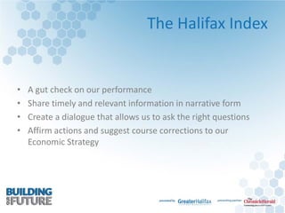 The Halifax Index serves as an economic assessment tool aimed at evaluating economic performance and fostering dialogue for actionable insights. It emphasizes a broad definition of economic progress, focusing on partnerships, workforce stability, and quality of life metrics. The report highlights challenges and strategies for sustainable workforce development, innovation, and community progress in Halifax, positioning it within the context of broader Canadian economic conditions.