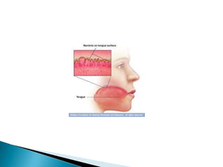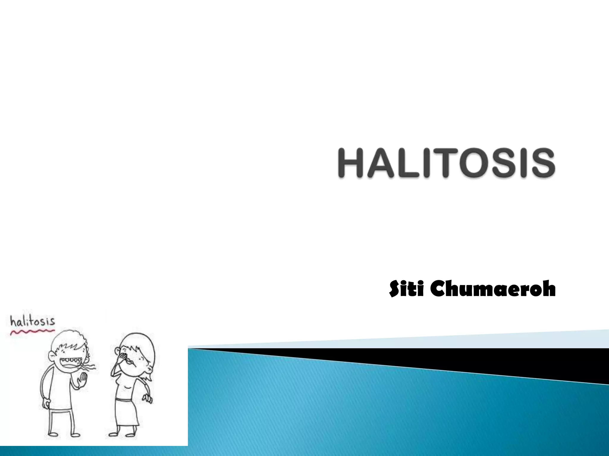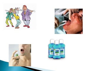 Halitosis is caused by volatile sulfur compounds produced by certain oral bacteria. The main locations of these bacteria are the tongue and areas of the mouth where debris can accumulate, such as under dental appliances or around gingivitis. Poor oral hygiene allows bacteria to grow, which break down proteins and amino acids into foul-smelling gases. Systemic conditions like respiratory, gastrointestinal, or liver diseases can also cause bad breath by introducing compounds into the saliva and oral cavity. Treatment involves identifying and addressing the underlying cause, improving oral hygiene, using antiseptics, and properly cleaning dental appliances.