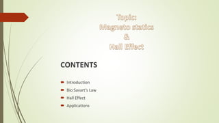 The document presents information about solid state physics concepts including Biot Savart's law, the Hall effect, and applications. Biot Savart's law states that the magnetic field produced by a current-carrying element is proportional to the current and inversely proportional to the square of the distance. The Hall effect occurs when a current-carrying conductor is placed perpendicular to a magnetic field, producing a voltage perpendicular to both. Applications of the Hall effect include determining semiconductor type, measuring magnetic fields and power in electromagnetic waves, and determining carrier mobility.