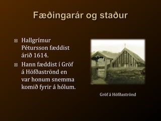 Fæðingarár og staðurHallgrímurPétursson fæddist árið 1614.Hann fæddist í Gröf á Höfðaströnd en var honum snemma komið fyrir á hólum.Gröf á Höfðaströnd