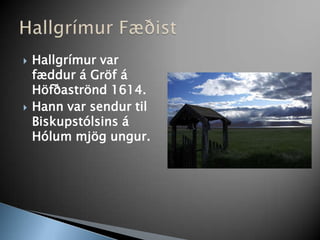 Hallgrímur var fæddurá Gröf á Höfðaströnd 1614. Hann var sendur til Biskupstólsins á Hólum mjög ungur. Hallgrímur Fæðist