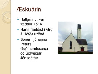 ÆskuárinHallgrímur var fæddur1614Hann fæddist í Gröf á HöfðaströndSonur hjónanna Péturs Guðmundssonar og Solveigar Jónsdóttur