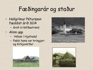 Fæðingarár og staðurHallgrímur Pétursson fæddist árið 1614 Gröf á Höfðaströnd Alinn upp Hólum í Hjaltadal Pabbi hans var hringjari og kirkjuvörður