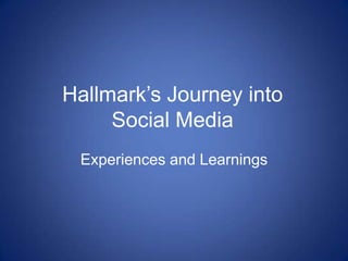 Hallmark has been exploring social media listening since 2000 to understand consumer insights and brand perceptions. They have worked with various vendors over the years to analyze social media data from platforms like blogs, forums and Twitter. Some key learnings include that it is difficult to generate truly new product ideas from social media data alone. However, social media can provide ideas for in-season marketing promotions and insights into consumer lives. Hallmark has also found that clear objectives are needed for meaningful data analysis, and that interpreting social media conversations requires significant time and labor. The presentation discusses various paradigm shifts that social media is bringing to market research practices.
