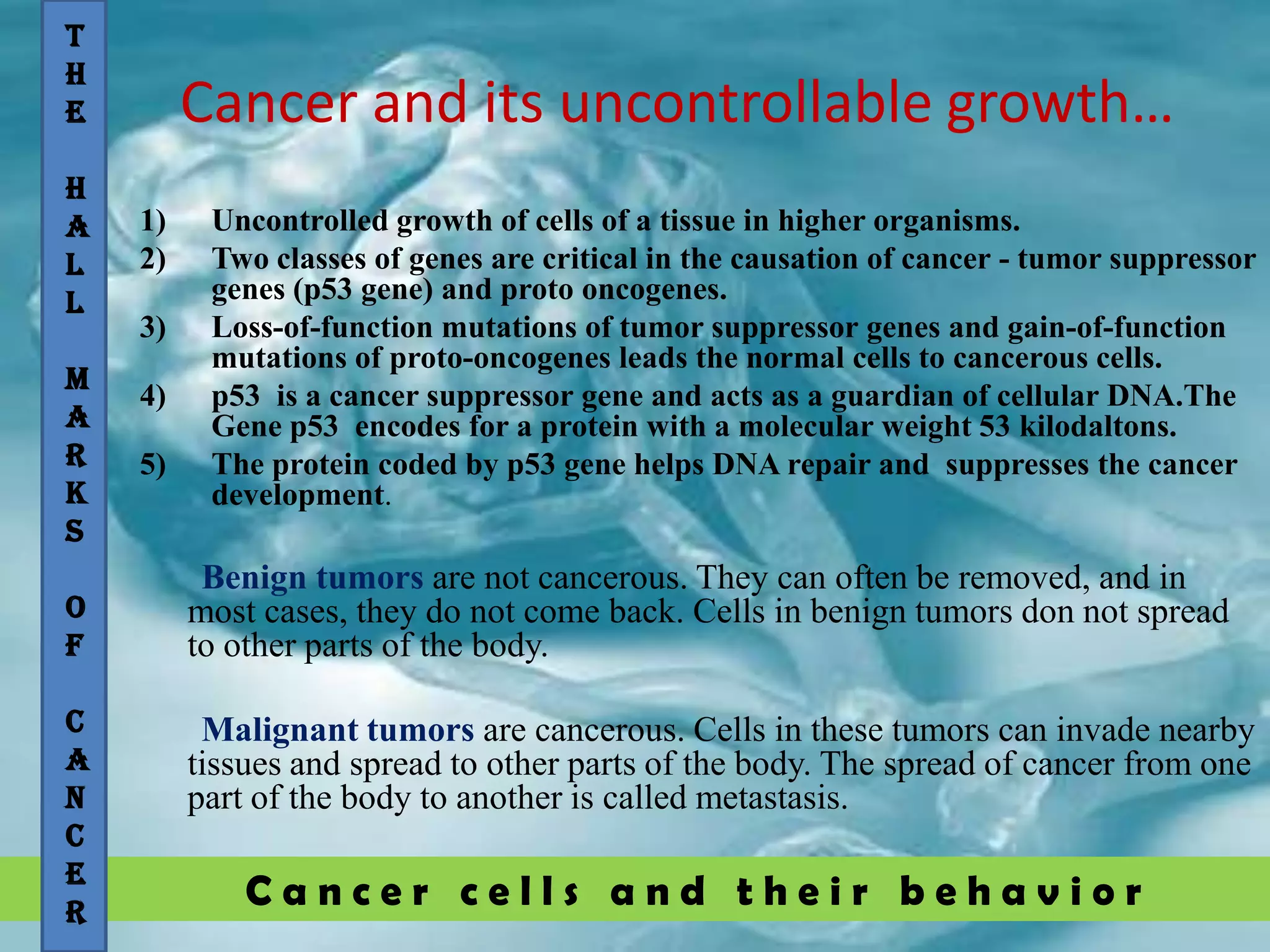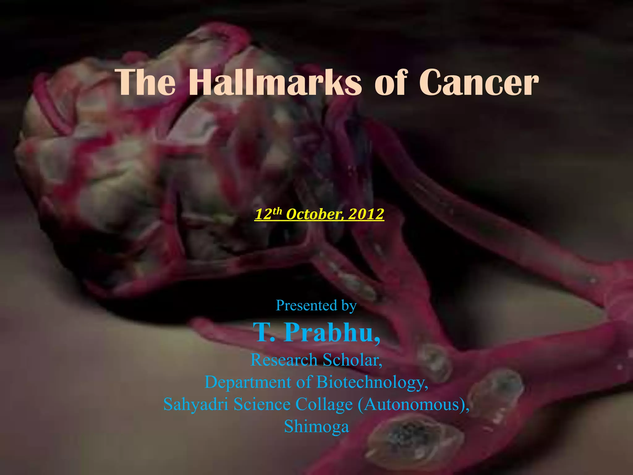 The document discusses the hallmarks of cancer. It describes six fundamental changes or hallmarks in cancer cells that allow them to grow uncontrollably and potentially spread throughout the body. These hallmarks are: self-sufficiency in growth signals, insensitivity to anti-growth signals, evading programmed cell death (apoptosis), limitless replicative potential, sustained angiogenesis, and tissue invasion and metastasis. The document provides details on each of these hallmarks and how they enable cancerous behavior in cells.