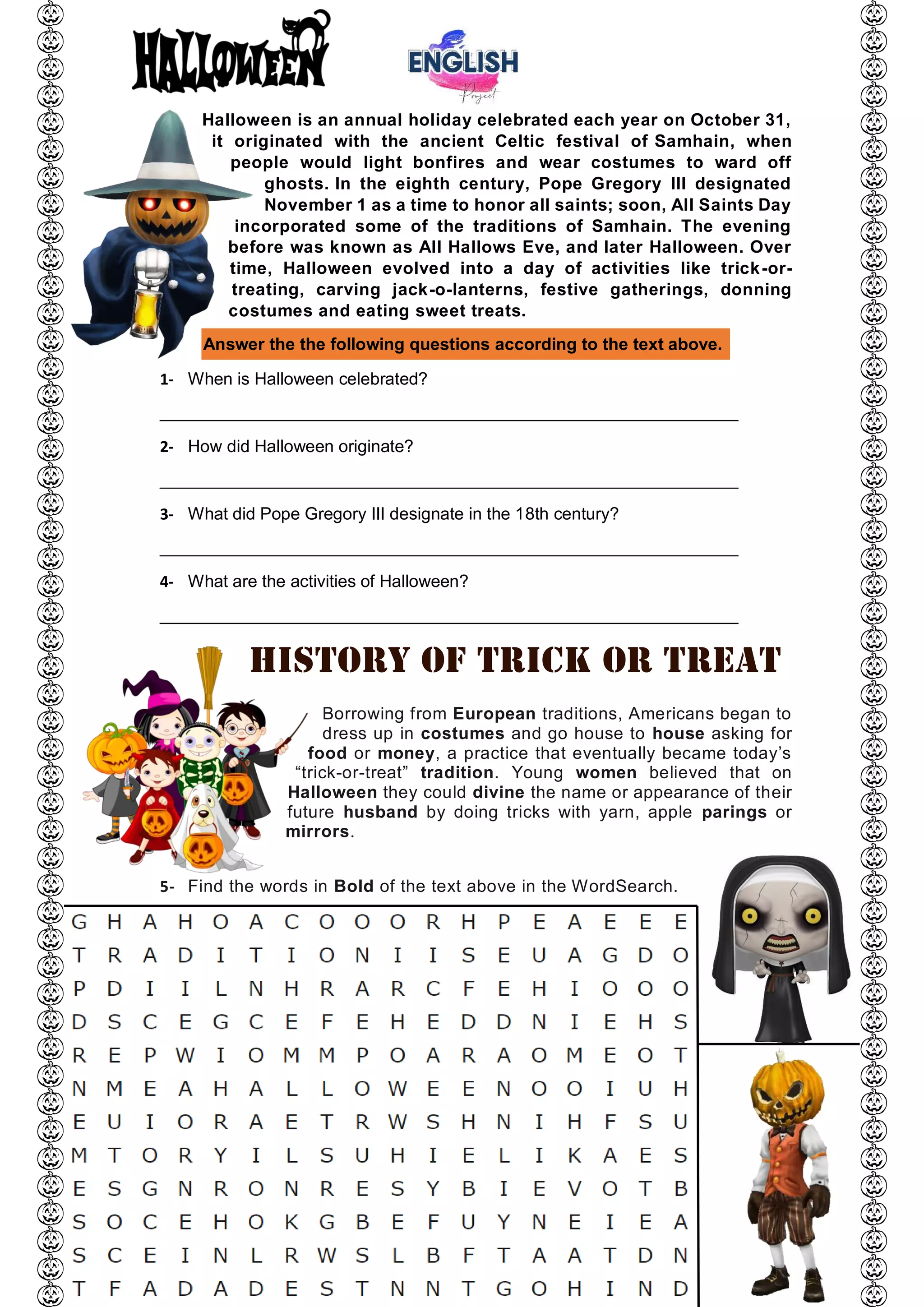 Halloween originated from the ancient Celtic festival of Samhain, where people would light bonfires and wear costumes to ward off ghosts. In the 8th century, Pope Gregory III designated November 1 as All Saints Day, incorporating traditions from Samhain. Halloween is now celebrated annually on October 31 through activities like trick-or-treating, carving jack-o-lanterns, wearing costumes, and eating sweets. Americans began the tradition of trick-or-treating by dressing in costumes and going door-to-door asking for food or money.