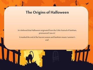 Halloween originated from the Celtic festival of Samhain, celebrating the end of the harvest season and believed to allow spirits of the dead to pass into this world. Traditionally known as All Hallows' Eve, it involved customs to honor deceased loved ones, including bonfires and games that predicted the future. Over time, Halloween has evolved with practices like trick-or-treating and dressing up, reflecting diverse meanings for different people.