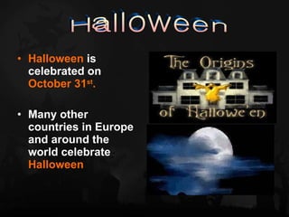 Halloween is celebrated on October 31st and has its origins in the Celtic tradition of believing the spirits of the dead returned on this day. Many families carve pumpkins together to make jack-o-lanterns and put them in their windows. Children dress up in costumes and go trick-or-treating, going door-to-door saying "trick or treat" and receiving candies from homes.