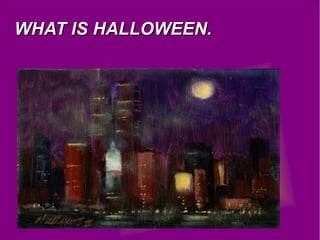 Halloween is celebrated on October 31st and involves wearing costumes and participating in traditions. Children go trick-or-treating by going door-to-door asking for treats, and if none are given a trick is played. People also carve jack-o-lanterns and attend costume parties. The celebration originated with the Celts in Britain as a festival to mark the end of the harvest season and onset of winter, believing it was a time when spirits could more easily cross into our world.