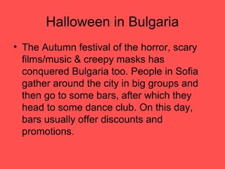 Halloween has become popular in Bulgaria. On Halloween, people in Sofia gather in large groups and go to bars that offer discounts, then to dance clubs. Originally a Catholic holiday celebrating All Saints and All Souls Days, Halloween has its origins in ancient Celtic traditions where people wore scary masks and costumes on October 31st to ward off spirits of the dead. Today, Halloween traditions vary around the world, from drinking tequila at Mexican graveyards to trick-or-treating for candy in the U.S. and carving jack-o-lanterns, which originated from an Irish myth about a man trapped between heaven and hell.