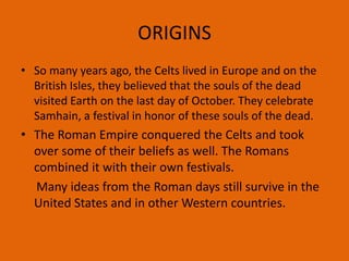 The document summarizes the origins and traditions of Halloween. It explains that the Celts celebrated Samhain to honor the souls of the dead visiting on the last day of October. The Romans conquered the Celts and combined their festivals. The Catholic Church established All Hallowmas on November 1st, with the night before known as All Hallowe'en or Halloween. Different countries have varying Halloween traditions, such as trick-or-treating in the US, Guy Fawkes Day celebrations in New Zealand, and leaving doors open for spirits in Poland. The document also outlines some Halloween superstitions.