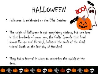 Halloween originated from a Celtic festival celebrating the souls of the dead on October 31st. It is a tradition for children to dress up in costumes and go trick-or-treating, asking for treats like candy from house to house. A popular Halloween food in Britain is toffee apples, which are apples coated in sugar sauce with a stick for a handle.