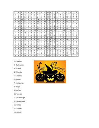 This document contains a series of random letters that likely do not form coherent words or sentences. Various Spanish words related to Halloween such as "calabaza" (pumpkin), "brujas" (witches), and "fantasmas" (ghosts) can be identified within the letters, but no overall meaning or message is discernible from the document.