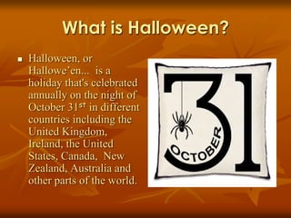 Halloween originated from the ancient Celtic festival of Samhain, celebrating the end of the harvest season. Modern Halloween traditions include trick-or-treating, wearing costumes, carving jack-o-lanterns, holding costume parties, and telling scary stories. Common Halloween symbols featured in celebrations are witches, black cats, ghosts, and pumpkins.