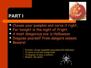 The poem describes the events and dangers of Halloween night. It warns readers to carve their pumpkins and disguise themselves, as witches and warlocks will be preparing dangerous brews. Without a costume, one should hide indoors from ghouls, ghosts, and goblins seeking to annoy or destroy. The poem closes by mentioning the sounds of trick-or-treating children and instructing readers to give them candy so they will go away, locking their doors and hoping the jack-o-lantern's candle stays lit.