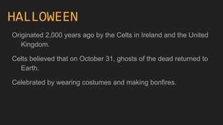 Halloween originated over 2,000 years ago from the Celts in Ireland and the UK, who believed that ghosts returned to earth on October 31. The holiday became popular in the USA in the 19th century with immigrants from Ireland, leading to traditions like trick-or-treating and carving pumpkins into jack-o-lanterns. Today, Halloween is celebrated with costumes, food, and various festivities.
