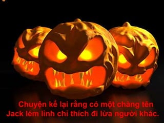 Chuyện kể về Jack, một chàng lừa đảo, đã khiến quỷ không thể xuống cây bằng cách khắc thánh giá quanh thân cây. Sau khi chết, Jack không được vào thiên đường hay địa ngục do quá khứ lừa dối, nên quỷ cho anh một đèn dẫn đường bằng củ cải, và đây là nguồn gốc của đèn ma trơi vào lễ Halloween. Halloween bắt nguồn từ lễ hội Samhain của người Celtic, diễn ra vào ngày 31 tháng 10, với truyền thống xua đuổi ma quỷ và tưởng niệm những linh hồn đã khuất.