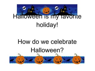 Halloween is the favorite holiday of the author. They celebrate by decorating houses with spiders, witches, ghosts and pumpkins. People carve jack-o-lanterns from pumpkins and put them outside. Children dress up in costumes, which can be funny, scary or famous, and go trick-or-treating by visiting neighbors' houses to receive candy or small toys. The author's favorite candy to eat on Halloween is chocolate.