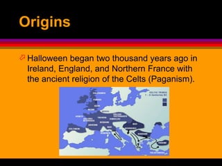 Halloween originated 2000 years ago among Celtic tribes in Ireland, England, and France who celebrated Samhain at the end of harvest season. They believed spirits visited on Samhain and wore costumes to avoid recognition. The traditions spread to America with Irish immigrants fleeing the potato famine. Today, Halloween celebrations include costumes, trick-or-treating, and carving jack-o-lanterns from pumpkins.