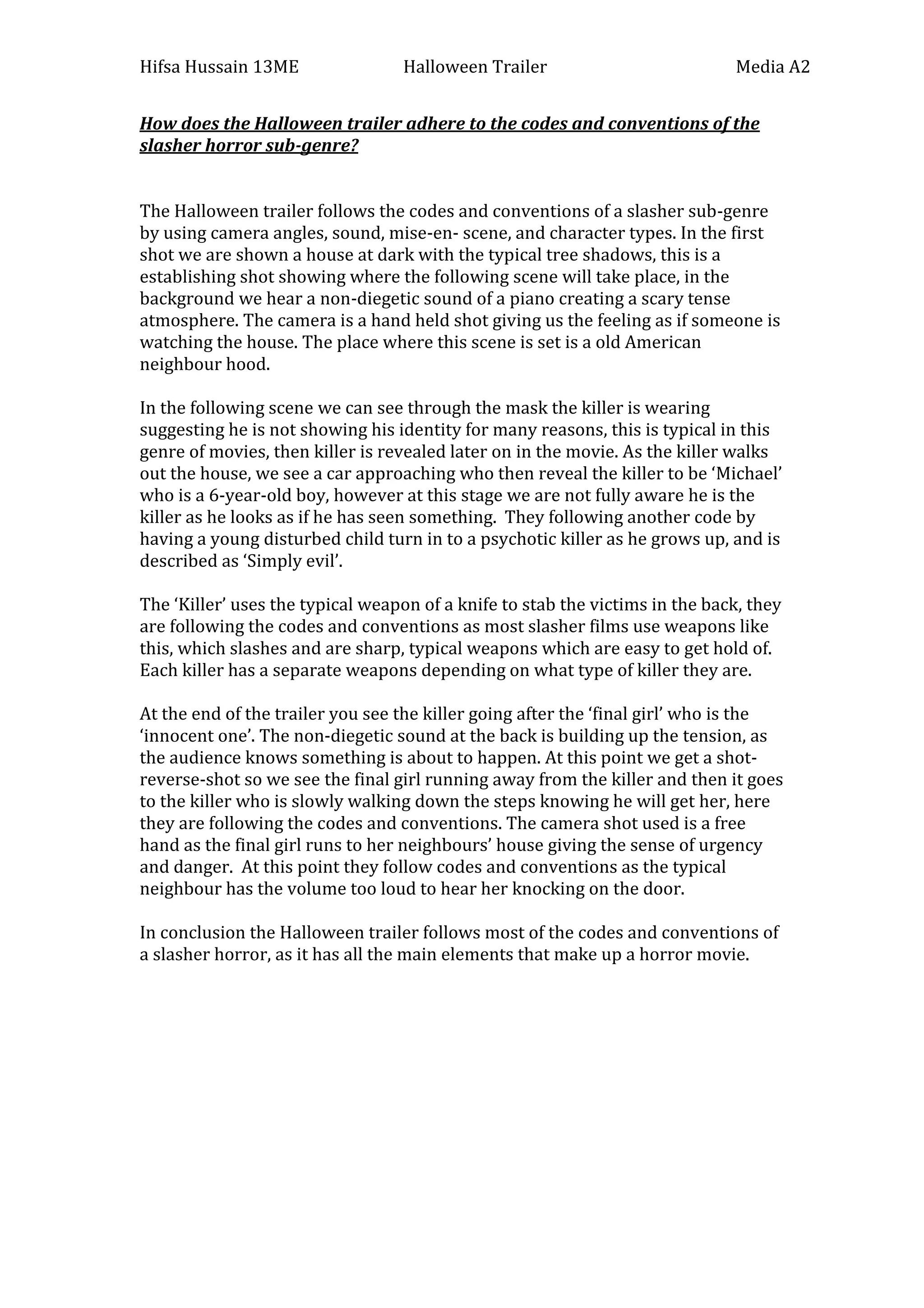 The document analyzes how the Halloween movie trailer adheres to the codes and conventions of the slasher horror sub-genre. It discusses how the trailer uses establishing shots, camera angles, sound, settings, weapons, and characters archetypes common to the genre. Specifically, it shows a tense scene of a house at night with shadowy trees and piano music. It then reveals the killer as a young disturbed boy who grows up to be a psychotic murderer. Finally, it depicts the killer chasing the "final girl" as tension-building music plays, showing the conventions of shot-reverse-shot and a neighbor unable to hear her calls for help.