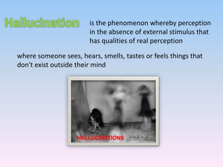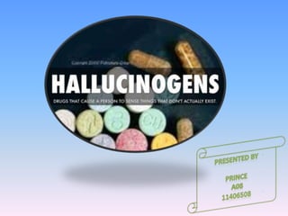 This document discusses hallucinations and different types of hallucinogenic drugs. It defines hallucinations as perceiving something without an external stimulus. The main types of hallucinations are auditory, visual, gustatory, and tactile. Common hallucinogenic drugs are discussed in depth, including LSD, psilocybin, mescaline, and cannabinoids. The document explains how these drugs work in the brain by interfering with serotonin and glutamate receptors to alter mood, perception, and behavior.