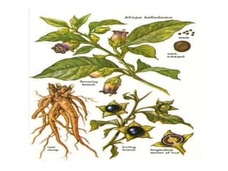 Hallucinogens are natural or synthetic substances that significantly alter one's consciousness by causing hallucinations such as seeing colors and objects that don't exist or experiencing altered perceptions of time, space, and senses. Some examples of hallucinogenic plants described in the document are belladonna, datura, morning glory, and psilocybin mushrooms. Belladonna contains tropane alkaloids that in large doses can cause effects like dilated pupils, blurred vision, and delirium. Historically, belladonna extracts have been used as a medicine to dilate pupils and as an antidote to other poisons, and it continues to be used recreationally as a hallucinogenic drug in some cases