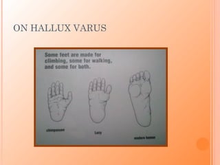 Hallux varus is a deformity of the great toe characterized by three key radiographic findings: a negative hallux abductus angle, negative IM 1-2 angle, and tibial sesamoid peaking. Patients typically present with pain, difficulty with shoes, and decreased push off ability. Treatment begins with orthotics and splinting but often requires surgery involving medial soft tissue release and lateral tightening, with tendon transfers used to correct deformity and maintain correction. Classification systems aim to guide surgical decision making by considering joint flexibility and deforming forces at work.