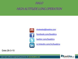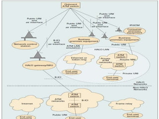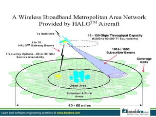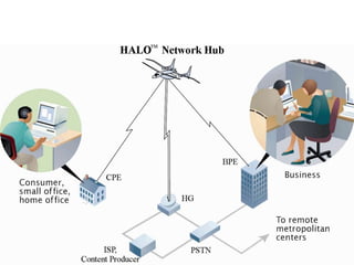 The document provides information about the HALO (High Altitude Long Operation) Network, which is a proposed wireless broadband network that would use high altitude platforms stationed (HAAPS) in the stratosphere to provide connectivity. Key points: