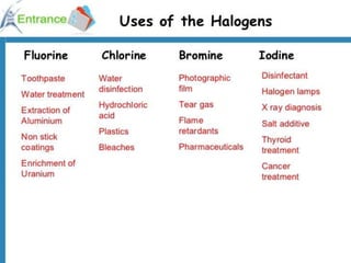 The document discusses halogens and their medicinal uses. It covers the five halogens found in group 17 of the periodic table (fluorine, chlorine, bromine, iodine, astatine) and their physical properties like density and electronegativity decreasing from fluorine to iodine. Halogens and halogenides have medical importance, with chlorinated lime, iodine solutions, and salts like sodium chloride being used. Hypochlorites are also discussed as unstable compounds containing hypochlorite ion, used for bleaching, disinfection and water treatment when in aqueous solution.