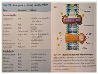 Halophiles are microorganisms that require high salt concentrations to survive and grow. They are found in hypersaline environments around the world. There are three main types of halophiles based on their salt requirements: slightly halophilic microbes grow best at 2-5% salt, moderate halophiles at 5-20% salt, and extreme halophiles, like Halobacterium salinarum, require at least 9% salt with optimal growth at 12-23% salt. Halophiles have adapted mechanisms like accumulating compatible solutes to balance osmotic pressure and transporting sodium ions to maintain cellular integrity in hypersaline conditions. Some halophiles have industrial applications involving carotenoid pigments, fermentation