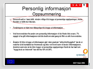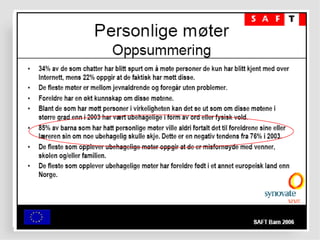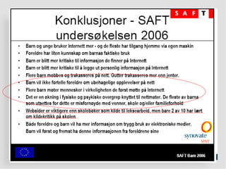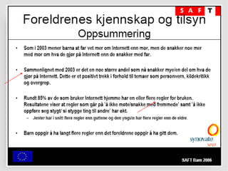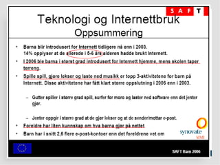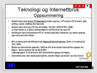 Filter på PCeller filter i huet? Barn og unge har blitt mer kritisk til hva de finner av informasjon på Internett Men hele 37% mener alt eller det meste av det de finner er sant 31% av foreldrene tror barna har lært kildekritikk, 36% tror ikke barna har lært dette Kilde: SAFT 2006 Ungene må utstyres med digital dømmekraft... En avis er ikke ett bevis...