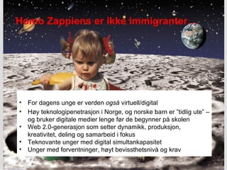 Homo Zappiens erikke immigranter… For dagens unge er verden også virtuell/digital Høy teknologipenetrasjon i Norge, og norske barn er ”tidlig ute” – og bruker digitale medier lenge før de begynner på skolen Web 2.0-generasjon som setter dynamikk, produksjon, kreativitet, deling og samarbeid i fokus Teknovante unger med digital simultankapasitet Unger med forventninger, høyt bevissthetsnivå og krav