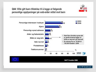 Paparazzikultur og ansiktsløsmobbing... To av ti under 30 år har ufrivillig mottatt sms eller mms med seksuelt innhold (13 prosent av hele befolkningen) En av tre under 30 år har mobilfotografert andre i tilfeller hvor objektet ikke er klar over å bli tatt bilde av (13 prosent av hele befolkningen) En av to under 30 år har ringt eller sent sms i fylla og senere angret på innholdet i samtalen eller meldingen (19 prosent av hele befolkningen) 65 000 barn som bruker nett har sendt hatefulle meldinger på nett. 75 000 barn har mottatt e-post som har skremt eller plaget. Kun 19% av disse har fortalt det til en voksen, og 10% har meldt det til politiet. 24% av nettbrukerne har fått uønskede seksuelle kommentarer, og en overvekt av disse er gutter. Referanse; NetCom 2007, SAFT barne- og ungdomsundersøkelse 2006