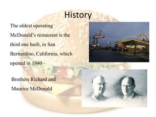 The oldest operating McDonald's restaurant opened in 1940 in San Bernardino, California. Ray Kroc franchised the first McDonald's restaurant in 1955 in Des Plaines, Illinois, which helped establish the modern corporation. By 1993, McDonald's had sold over 100 billion hamburgers and now has over 31,000 restaurants in 119 countries serving 58 million customers daily.