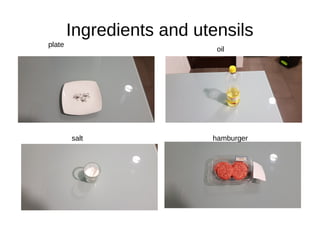 This document provides instructions for frying a hamburger. It lists the ingredients as a plate, oil, and hamburger. The utensils needed are a pan, spatula, and spoon. The steps are to heat the pan, add oil, place the hamburger in the pan and fry each side for 30 seconds, then add a pinch of salt.