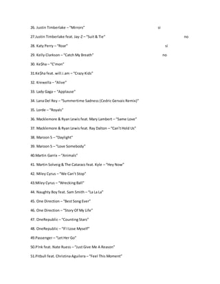 This document lists 68 songs and indicates whether each song is suitable ("si") or not suitable ("no") for a particular event or purpose. Most of the songs receive an indication of either "si" or "no", while a few songs receive the designation "maso maso" which possibly means "so-so" or "neutral". The list appears to be evaluating recent popular songs from 2013 on their appropriateness for the event or purpose in question.